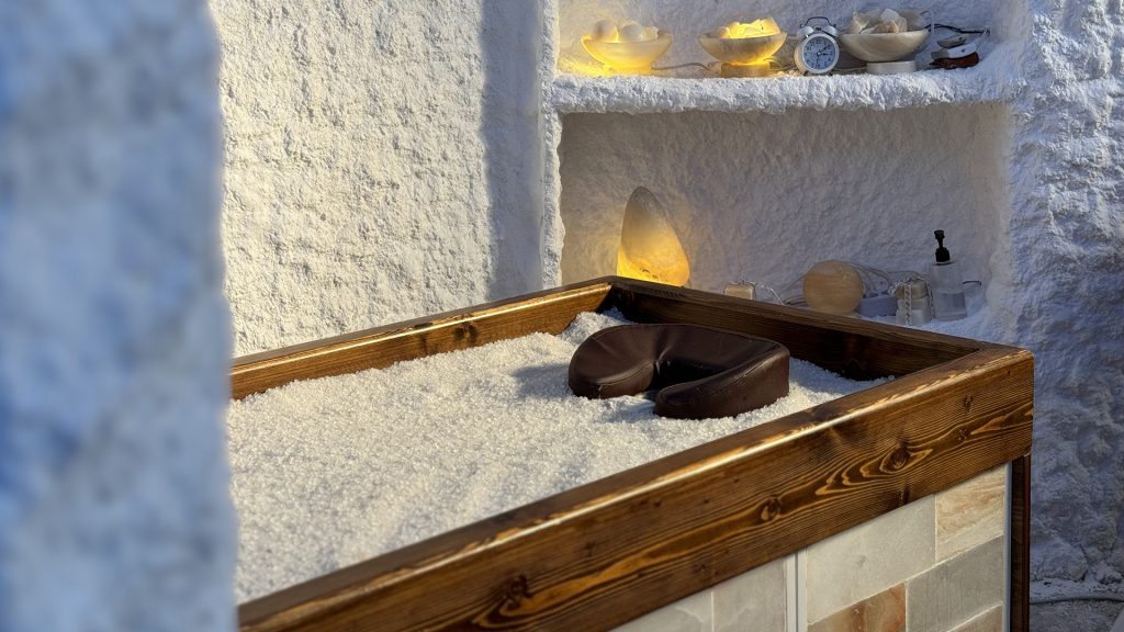 به منظور تجهیز اتاق ماساژ نمک دو تخت نمک استاندارد و VIP در نظر گرفته شد و در قسمت ریلکسی، یک دستگاه هالوژنراتور نصب و تجهیز گردید.